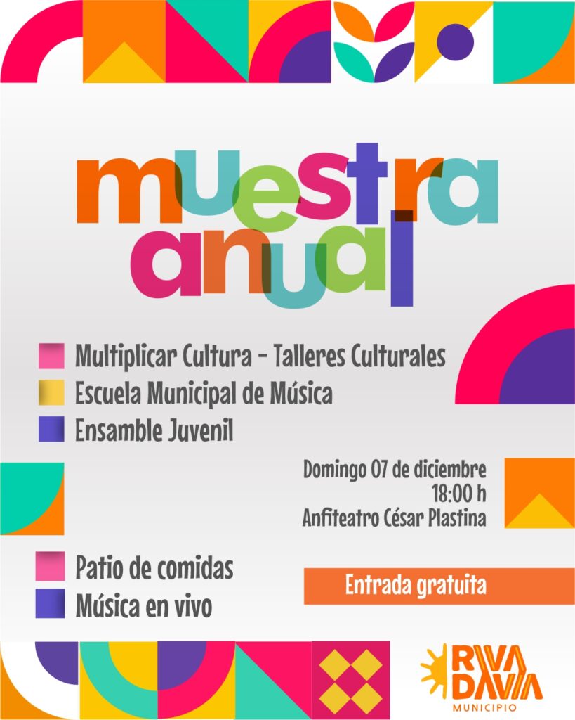 El Municipio de Rivadavia invita a toda la comunidad a participar de la Muestra Anual, un evento que reúne el trabajo desarrollado durante el año por los distintos espacios culturales del departamento. La actividad se realizará el domingo 7 de diciembre, a las 18:00 hs., en el Anfiteatro César Plástina, con entrada gratuita.
