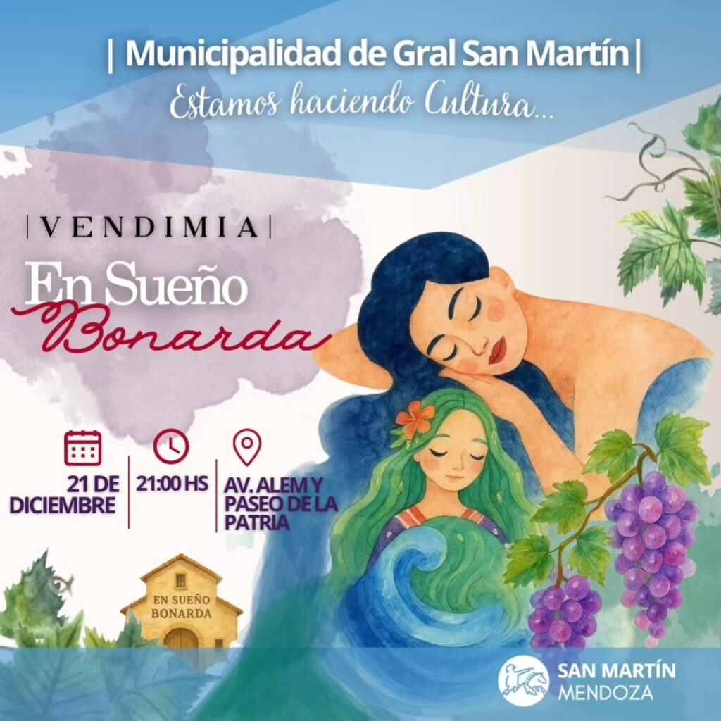 El domingo 21 de diciembre, desde las 21 hs., San Martín vivirá su fiesta mayor con la celebración y elección de la Reina de la Vendimia del departamento. El espectáculo tendrá lugar en Avenida Alem y Paseo de la Patria, donde se presentará una puesta artística que reunirá a bailarines, músicos y actores para homenajear el trabajo y la cultura de la región.