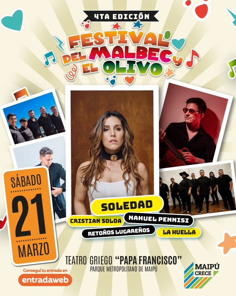 El sábado 21 de marzo, desde las 18 hs. y con una impronta marcada por la tradición, las raíces y la identidad territorial. La jornada contará con las presentaciones de Soledad Pastorutti, Nahuel Pennisi, Cristian Soloa, Retoños Lugareños y La Huella. El folclore será protagonista en una noche pensada para compartir en familia, donde el vino, los productos olivícolas y la música conectan con la historia y el origen maipucino.