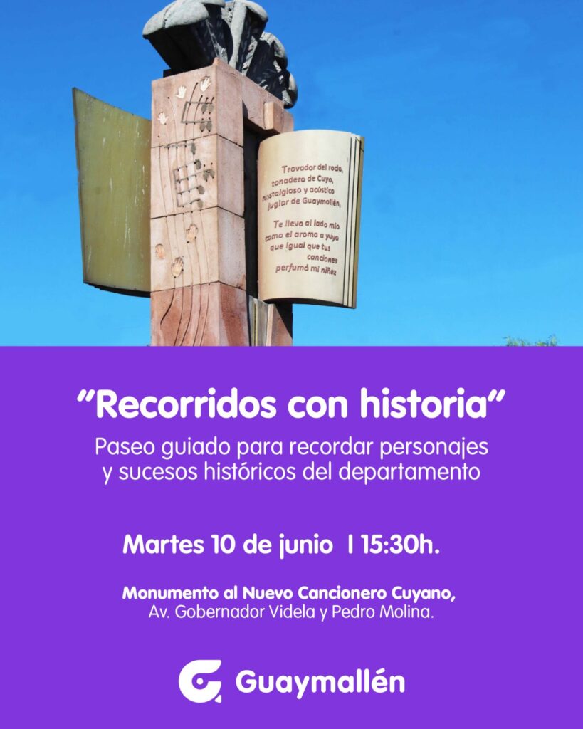 La Municipalidad organiza una nueva edición del programa “Recorridos con historia”, una iniciativa que invita a vecinos y turistas a descubrir los orígenes de Guaymallén. La cita es el próximo martes 10 de junio, a las 15:30 hs., en el monumento al Nuevo Cancionero Cuyano, ubicado en Av. Gobernador Ricardo Videla y Pedro Molina. La actividad es gratuita y requiere inscripción previa.