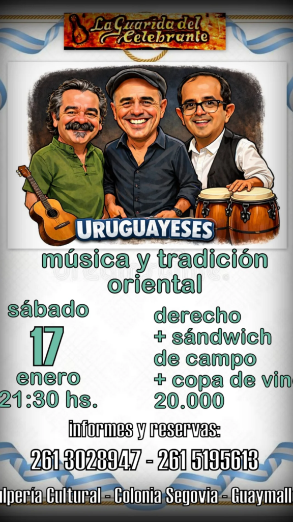 El trío Uruguayeses se presentará en Mendoza con una propuesta que combina música popular y tradición oriental. El encuentro será el sábado 17 de enero, a las 21.30 hs., en La Guarida del Celebrante, (Carril Buenos Vecinos 7598, Colonia Segovia, Guaymallén) espacio cultural que continúa apostando a espectáculos íntimos y de fuerte raíz identitaria.