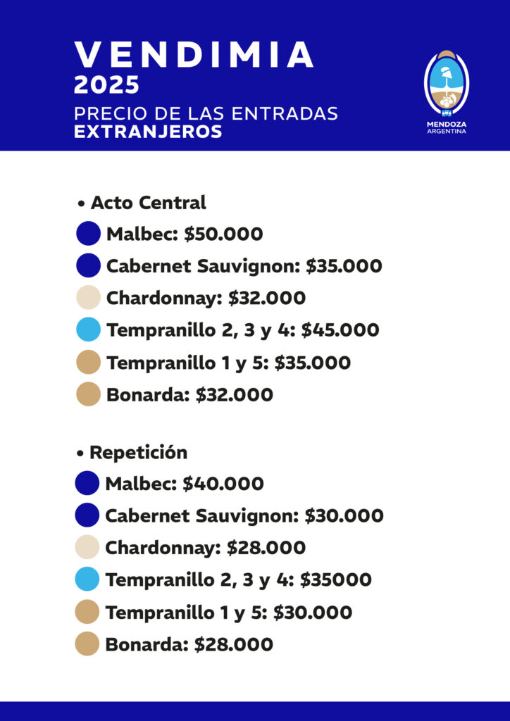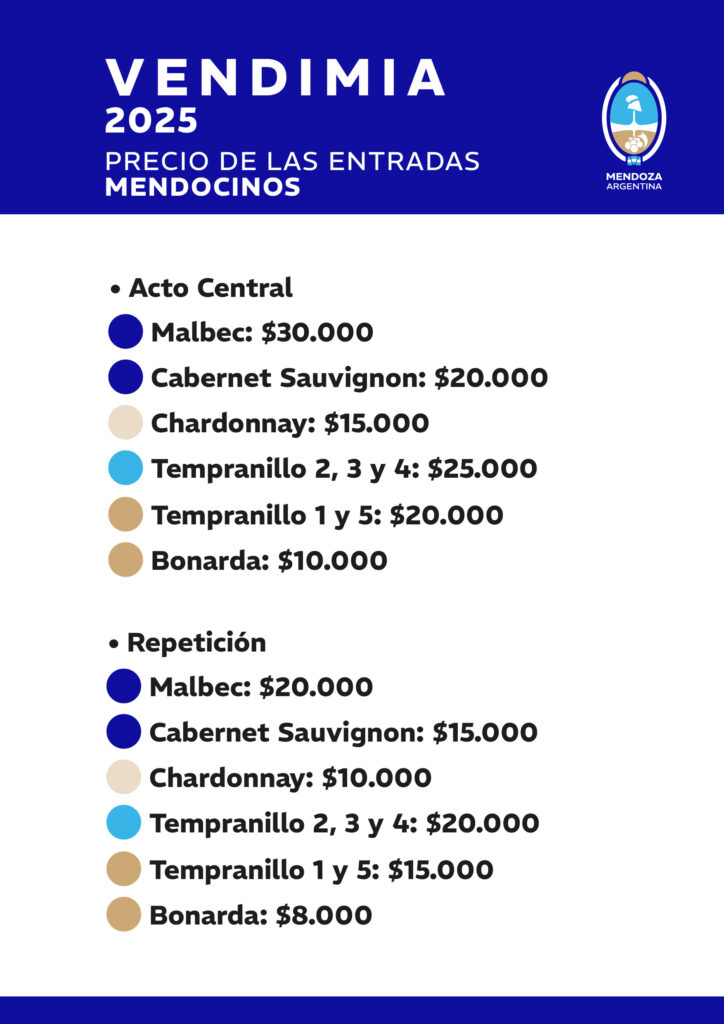 En tanto, para la Repetición el costo de las entradas será: para el sector Malbec, $40.000; Cabernet Sauvignon, $30.000; Chardonnay, $28.000; Tempranillo 2, 3 y 4, $35.000; Tempranillo 1 y 5, $30.000, y para el sector Bonarda, $28.000.