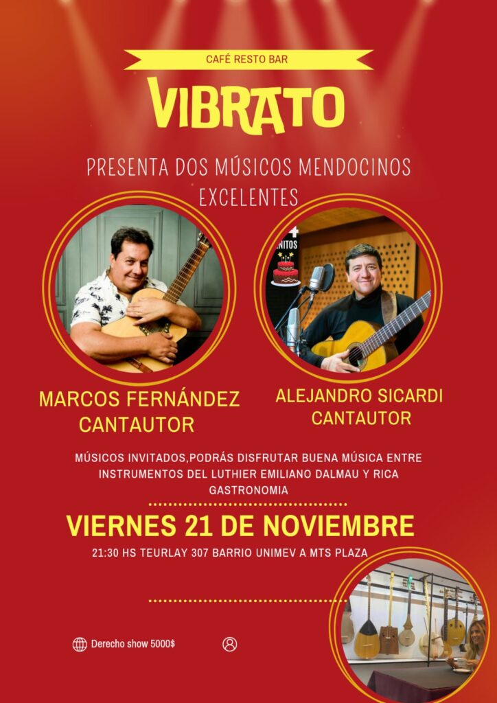 El café resto bar Vibrato propone una velada especial dedicada a la música mendocina, con la presentación de dos destacados cantautores: Marcos Fernández y Alejandro Sicardi.