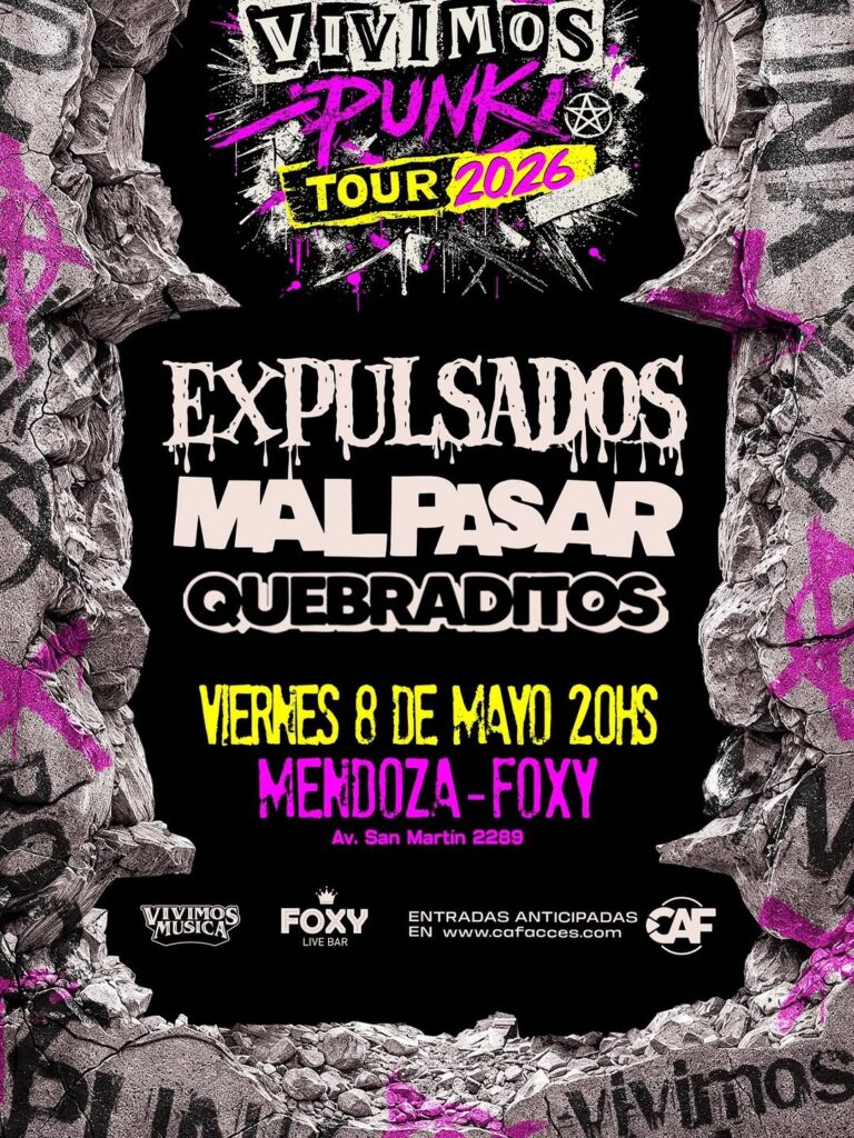 La escena del punk rock nacional tendrá una cita imperdible en la provincia el próximo viernes 8 de mayo. El Vivimos Punk Tour 2026 desembarca en Mendoza con una propuesta que reúne a tres bandas referentes del género: Expulsados, Mal Pasar y Quebraditos, quienes compartirán escenario por primera vez en territorio mendocino.